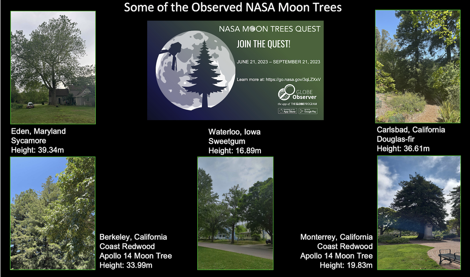 We are asking GLOBE Observer volunteers in the United States to help us find and measure the tree heights of Apollo 14 Moon Trees species (Douglas-fir, loblolly pine, sweetgum, sycamore, and coast redwood) and actual Apollo 14 Moon Trees around the United States with this regional data quest.
