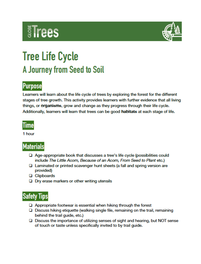 The GLOBE Trees Family Guide is a selection of resources for taking a trees science journey with family and friends. The content is organized by themes (tree height, trees and carbon, impacts on trees, and trees as habitats) and grouped by age-level of learner.