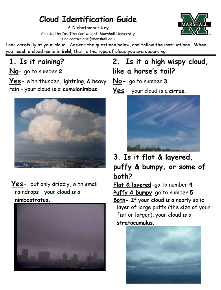 This interactive web-based tool asks a series of questions to help you narrow down the type of cloud you are observing. It can be used both for practice and in the field to identify clouds. Based on the original Cloud Identification Key developed by Dr. Tina Cartwright, Marshall University, West Virginia