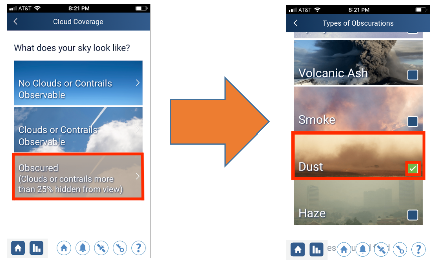 See clouds? Then use the steps within the app to report total cloud cover and cloud types, and don’t forget to add your photographs of the sky. Are you seeing something else in the sky like dust, haze or even smoke? Then use the steps below to send in the report and photographs! Use these tips to help you figure out if you are looking at clouds or at an obscuration like smoke or dust.