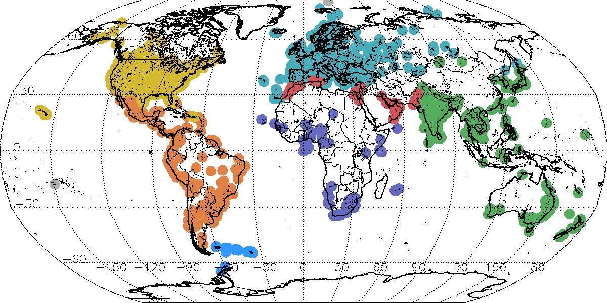 Total cloud observations reported by GLOBE Observer users during the 2018 GLOBE Clouds Spring Data Challenge, color coded by political region as defined by the GLOBE Program (https://www.globe.gov/globe-community/community-map).