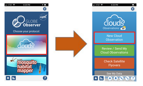 First, use the GLOBE Observer app and select clouds and choose “New Cloud Observation”.
