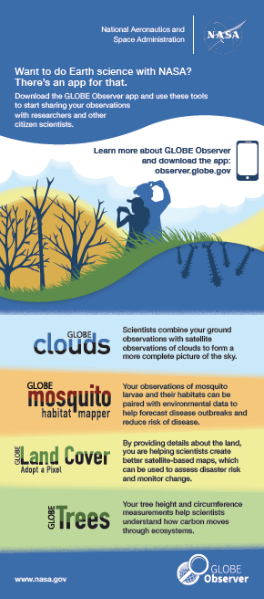 This rack card describes the tools within the GLOBE Observer app in English and Spanish. It is designed to be printed on 4" x 9" cardstock. Note: This file is in CMYK, and the colors may not display properly in your web browser. Please download and open the file on your desktop to preview the colors.